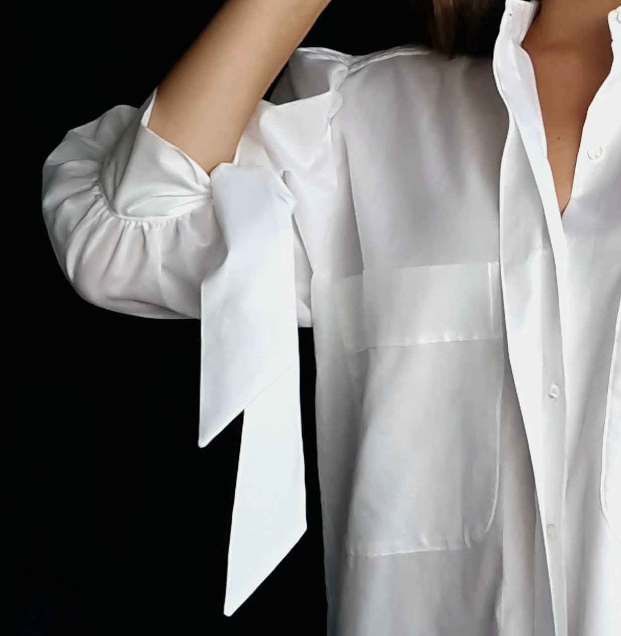 Una camicia bianca in popeline di cotone 100%, caratterizzata da un'ampia vestibilità che offre comfort e stile. Le maniche presentano un'arricciatura superiore che aggiunge un tocco di eleganza e volume, terminando con fiocchi ai polsi che conferiscono un dettaglio romantico e femminile.