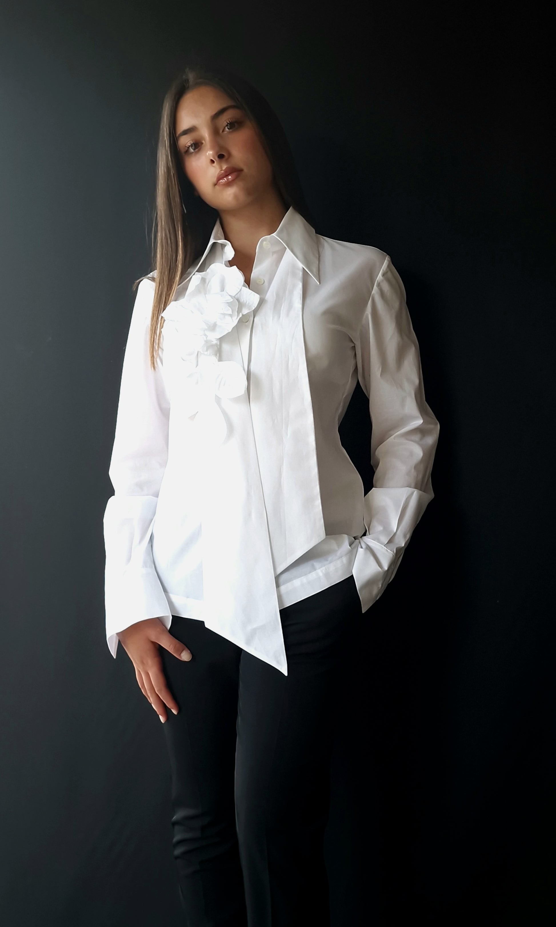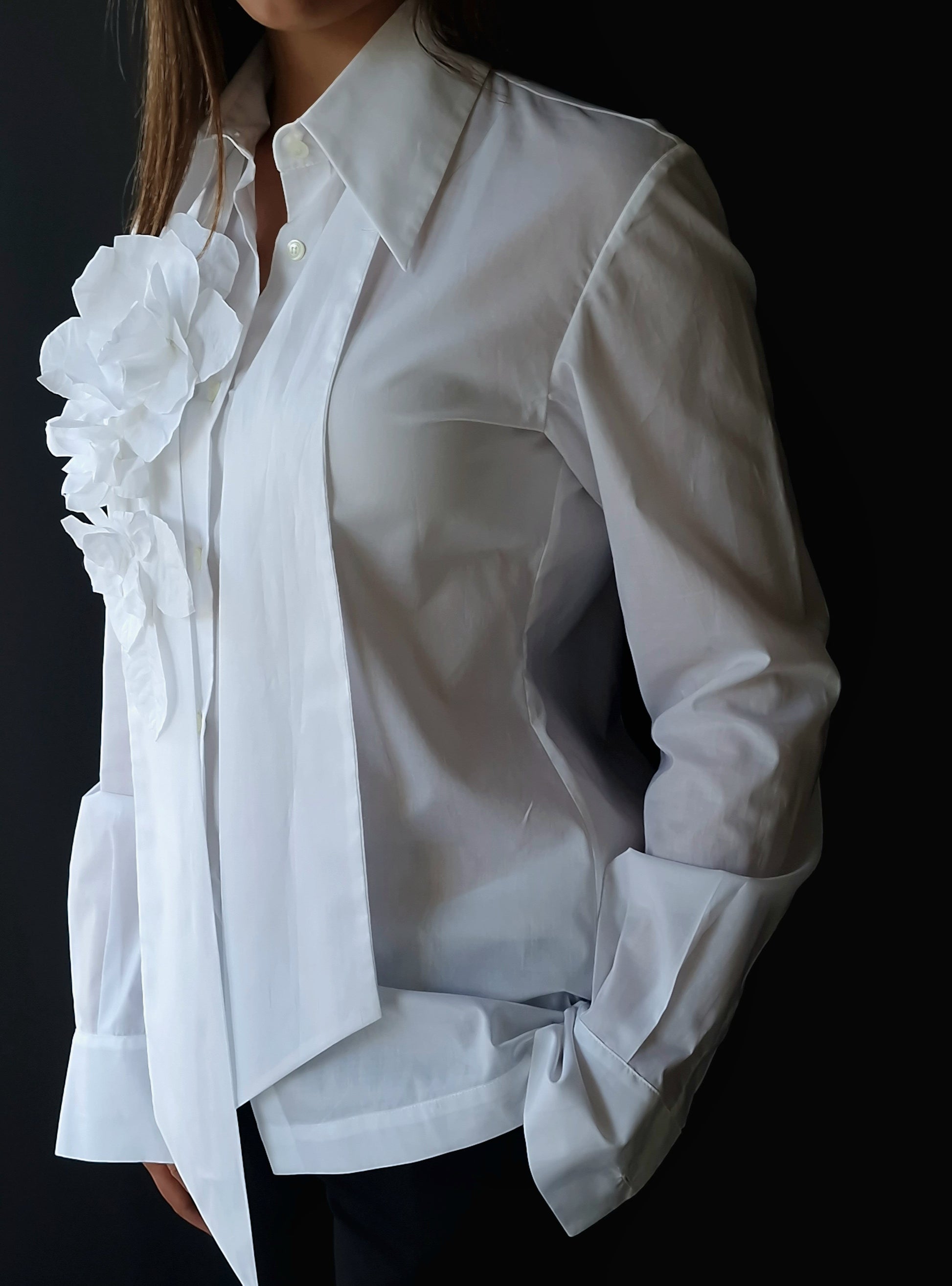 To further enrich this shirt, we find a cotton tie, which adds an element of sophistication and uniqueness. The tie is embellished with a fabric flower appliqué, which brings a touch of romance and femininity. These floral details break up the rigidity of the tie, creating a perfect balance between elegance and sweetness.